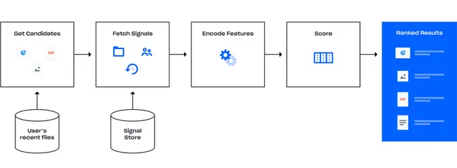 - Score: We’re finally ready to do the actual ranking. We pass the feature vector for each file to the ranking algorithm, get back a score per file, and sort by that score. The top-ranked results are then permission-checked again before being shown to the user.