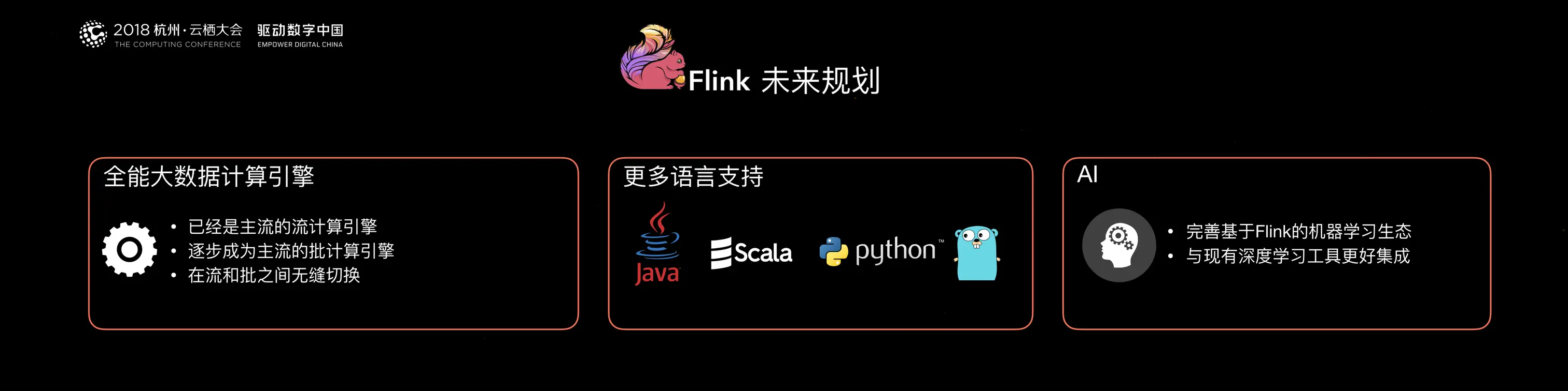 最后不得不说AI,因为现在很多大数据计算的需求和数据量都是在支持很火爆的AI场景,所以在Flink流批生态完善的基础上,将继续往上走,完善上层Flink的Machine Learning算法库,同时Flink往上层也会向成熟的机器学习,深度学习去集成。比如可以做Tensorflow On Flink, 让大数据的ETL数据处理和机器学习的Feature计算和特征计算,训练的计算等进行集成,让开发者能够同时享受到多种生态给大家带来的好处。