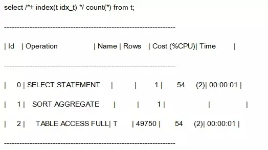 *在某些情况下,如果CBO认为Hint会导致错误结果,那么Hint则会忽略。该例子中因为ID字段可能为空,而索引是保存空值的,因此count(*)使用索引将导致错误的结果,故而使用了全表扫描,忽略了Hint。