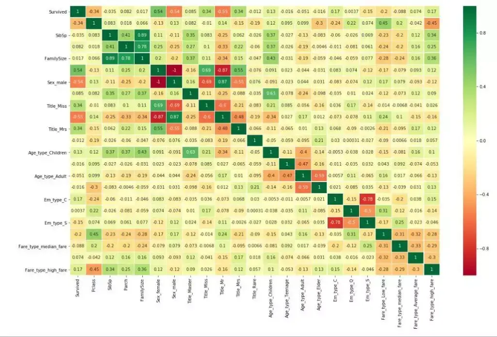 all_data = train_dffor dataset in all_data : dataset['FamilySize'] = dataset['SibSp'] + dataset['Parch'] + 1import re# Define function to extract titles from passenger namesdef get_title(name): title_search = re.search(' ([A-Za-z]+)\.', name) # If the title exists, extract and return it. if title_search: return title_search.group(1) return ""# Create a new feature Title, containing the titles of passenger namesfor dataset in all_data: dataset['Title'] = dataset['Name'].apply(get_title)# Group all non-common titles into one single grouping "Rare"for dataset in all_data: dataset['Title'] = dataset['Title'].replace(['Lady', 'Countess','Capt', 'Col','Don', 'Dr', 'Major', 'Rev', 'Sir', 'Jonkheer', 'Dona'], 'Rare')dataset['Title'] = dataset['Title'].replace('Mlle', 'Miss') dataset['Title'] = dataset['Title'].replace('Ms', 'Miss') dataset['Title'] = dataset['Title'].replace('Mme', 'Mrs')for dataset in all_data: dataset['Age_bin'] = pd.cut(dataset['Age'], bins=[0,14,20,40,120], labels=['Children','Teenage','Adult','Elder'])for dataset in all_data: dataset['Fare_bin'] = pd.cut(dataset['Fare'], bins=[0,7.91,14.45,31,120], labels ['Low_fare','median_fare', 'Average_fare','high_fare'])traindf=train_dffor dataset in traindf: drop_column = ['Age','Fare','Name','Ticket'] dataset.drop(drop_column, axis=1, inplace = True)drop_column = ['PassengerId']traindf.drop(drop_column, axis=1, inplace = True)traindf = pd.get_dummies(traindf, columns = ["Sex","Title","Age_bin","Embarked","Fare_bin"], prefix=["Sex","Title","Age_type","Em_type","Fare_type"])现在,你已经创建完成所有的特征了。接着我们看看这些特征之间的相关性:
