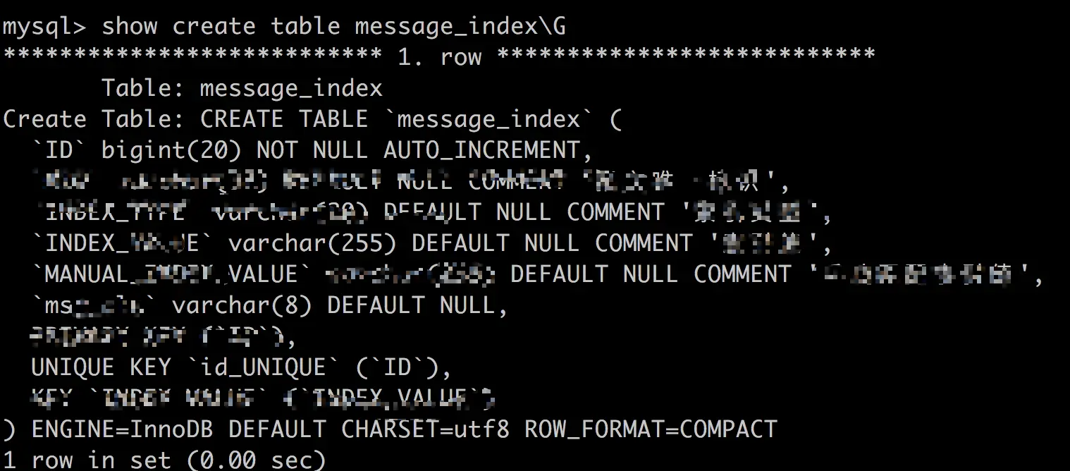 - 在数据库中执行show create table语句 注意需要在show create table 查看表结构之前执行flush tables语句,因为如果message_index表之前被打开过,那么表结构会被缓存在内存中,show create table不会报错,也就无法从错误日志中拿到我们需要的信息。