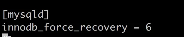 - 在MySQL配置文件中添加innodb_force_recovery=6,并重启数据库