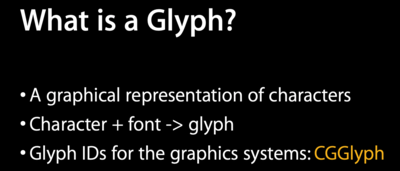 字符加字体可以得到字形,在 Cocoa 中我们通过字体可以得到 CGGlyph,渲染的时候我们使用 CTFont 的方法传入 CGGlyph 就可以渲染出实际的文字。