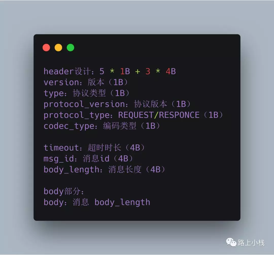 请求-响应设计:区分请求或响应类型,引入消息类型标识REQUEST(byte)0、RESPONCE(byte)1;消息主体需利用编码器序列化框架进行编码解码,引入编码类型;在请求响应过程中,利用消息id作为唯一标识,利用超时时间来检测服务器处理时效,超时直接不返回;引入body_length来标识消息主体的长度,使得协议可变长。