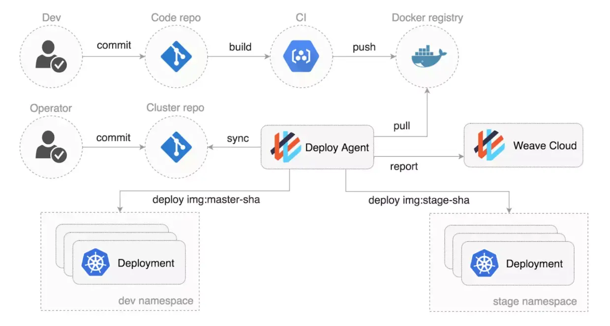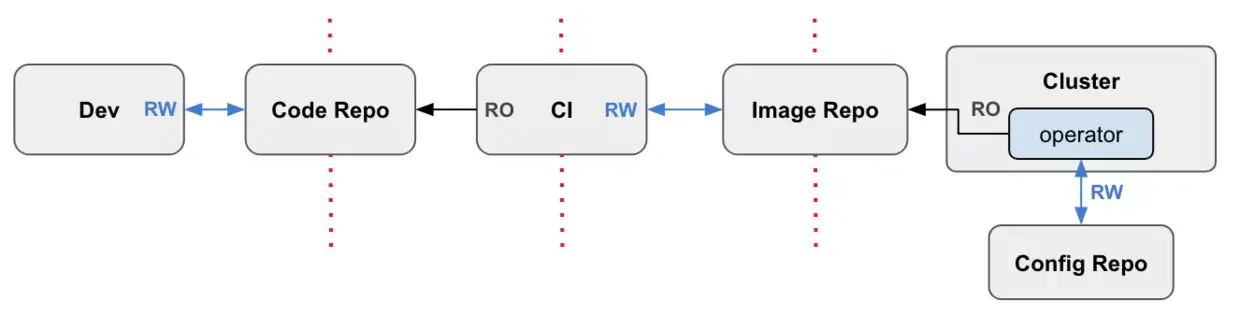 部署到集群的 Kubernetes Operator 可以监视仓库中的新镜像。更进一步,如果您的整个集群状态(通过声明性清单)都保存在 Git 中,那么“diff alert”可以成为从仓库中“提取”新镜像并将其部署到集群的动力。这不仅是一种更安全的部署方法,而且还为开发人员提供了一种更简单的方法来应用和回滚生产环境的更改。