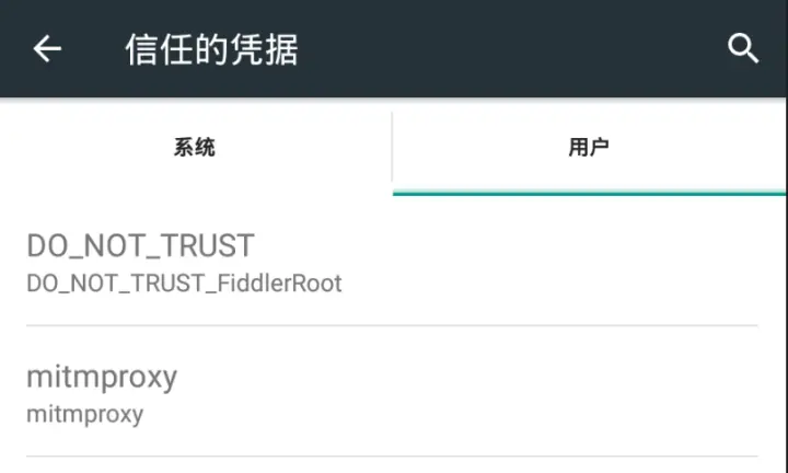 证书列表:(设置-安全-信任的凭证) 一个fiddler的证书,一个mitmproxy的证书