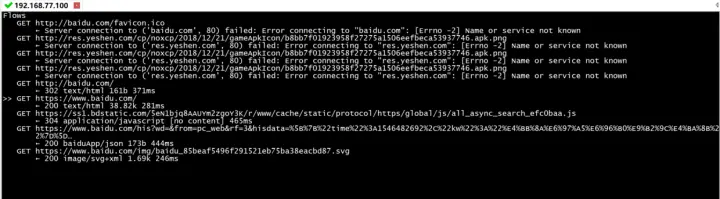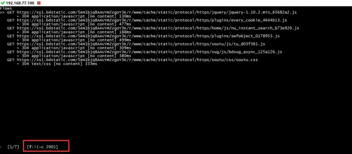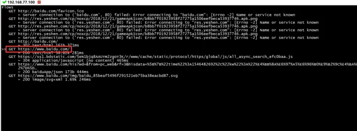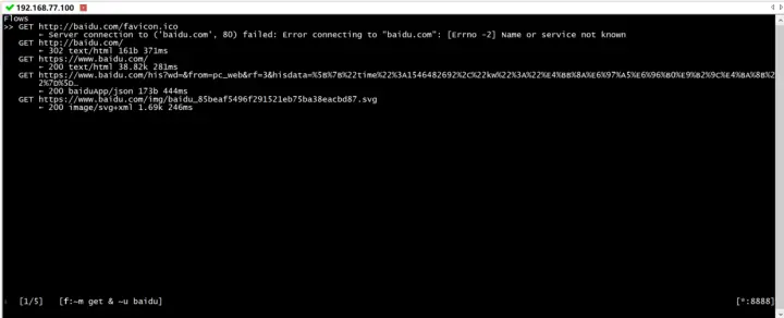 set intercept=~d baidu.com & ~m get出现标红的地址,就是被mitmproxy进行的拦截