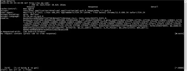 set intercept=~d baidu.com & ~m get就是被mitmproxy进行的拦截。