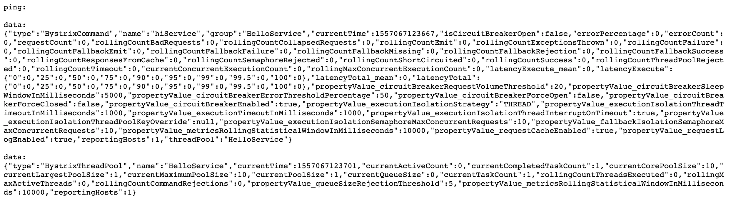 再打开http://localhost:8763/actuator/hystrix.stream,可以看到一些具体的数据: