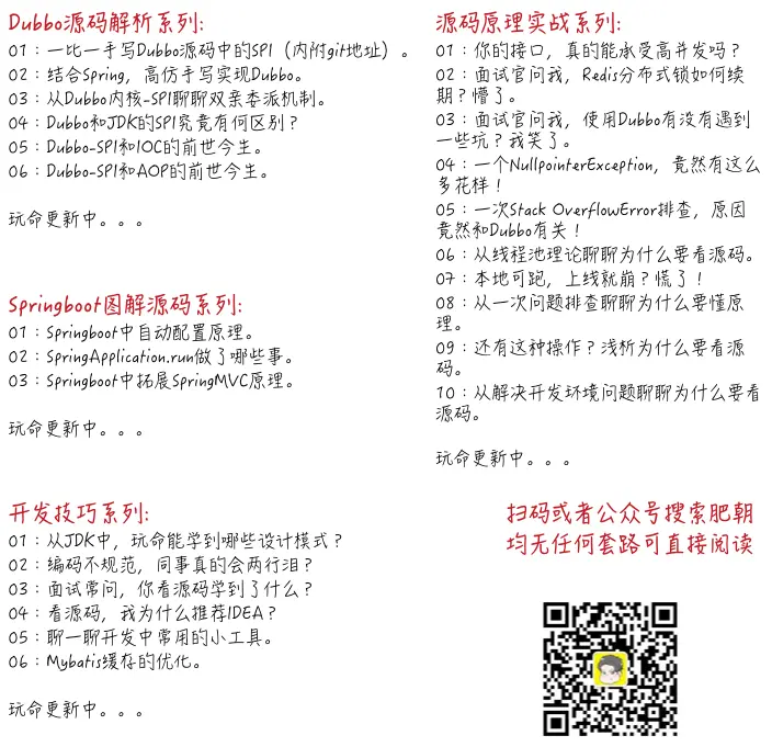 运行结果如我们所料.但是具体要怎么编码,怎么发送请求,又如何解码好像也没说啊.没说?没说就对了.在完结服务引用这个小专题后,还会重点和大家看一下dubbo中的编解码,spi,javassist等重点内容源码,等粗略把整个框架的思想都掌握后,再手把手临摹一个五脏俱全(包含设计模式,dubbo架构设计)的简易dubbo框架.总之一句话,关注肥朝公众号即可.