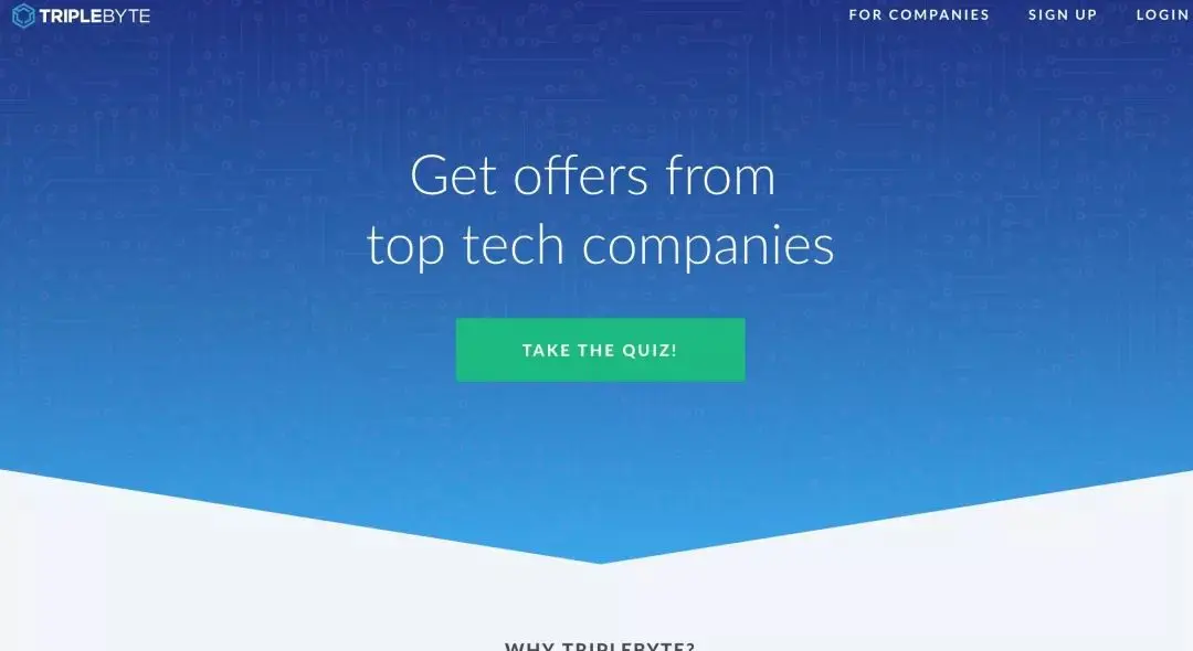 在这里,你不需要提交简历,而是1.参加网站的在线quiz, 2.和Triplebyte进行谈话。之后,Triplebyte会根据你的测试结果和科技公司的职位进行匹配。如果匹配成功,你就可以跳过这些公司的电话面试,直接参加onsite终面。
