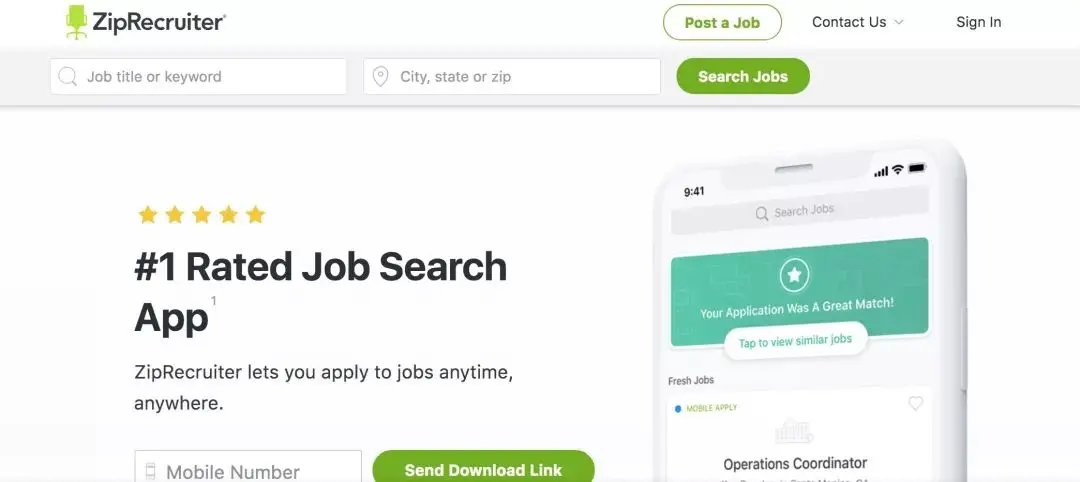 简历投递途径快捷简单。设置好个人简历,就可以在一分钟之内点无数个一键申请选项。适合海投。 非常简洁的网络平台招聘流程。 ZipRecruiter会及时给你更新申请进度,如果招聘方看了你的简历,你会收到邮件“Your resume was viewed by …”,然后你就可以看看是会接到约面试的电话还是不到第一轮就挂了。 企业可以在线面试所有的申请者。