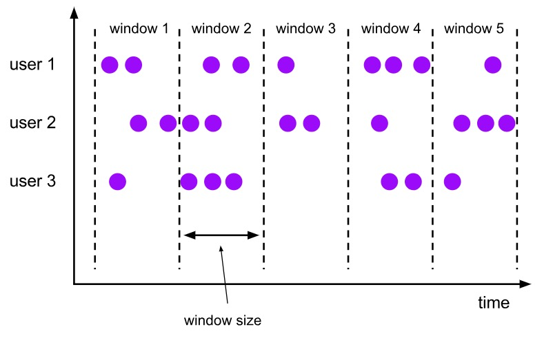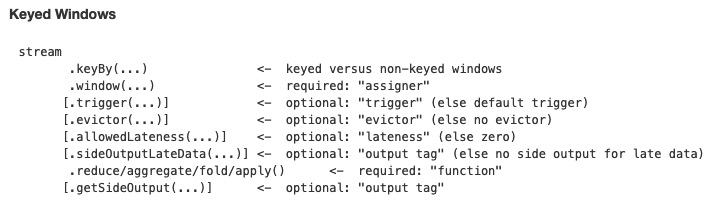 window 方法接收的输入是一个WindowAssigner, WindowAssigner 负责将每条输入的数据分发到正确的 window 中(一条数据可能同时分发到多个 Window 中),Flink 提供了几种通用的 WindowAssigner:tumbling window(窗口间的元素无重复),sliding window(窗口间的元素可能重复),session window 以及 global window。如果需要自己定制数据分发策略,则可以实现一个 class,继承自 WindowAssigner。