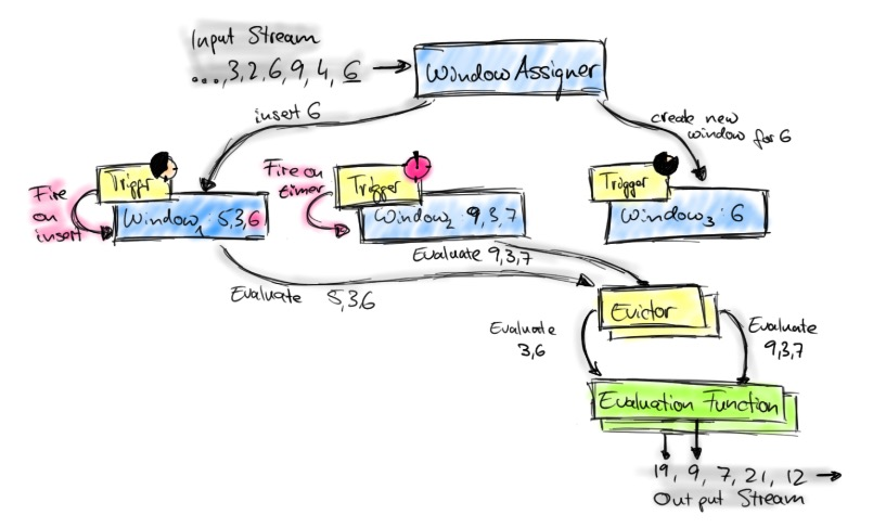 每条数据过来之后,会由 WindowAssigner 分配到对应的 Window,当 Window 被触发之后,会交给 Evictor(如果没有设置 Evictor 则跳过),然后处理 UserFunction。其中 WindowAssigner,Trigger,Evictor 我们都在上面讨论过,而 UserFunction 则是用户编写的代码。