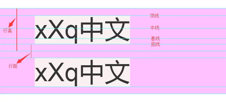 即:将行距的值(行高 - 字体尺寸)除以2,并分别增加到content area的上下两边。我们经常通过设置行高与容器高度一致从而使单行文字垂直居中就是利用了这个原理,其实真正被居中的是content area