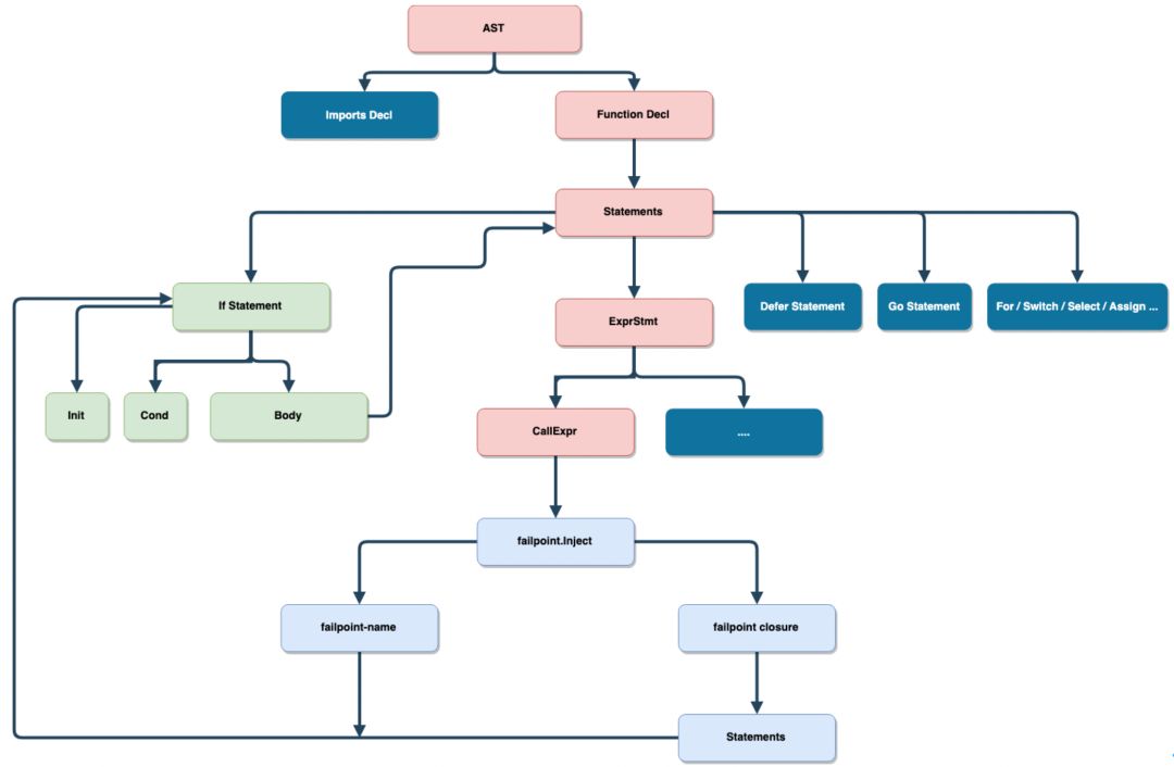 对于任何一个 Golang 代码的源文件,可以通过解析出这个文件的语法树,遍历整个语法树,找出所有 failpoint 注入点,然后对语法树重写,转换成想要的逻辑。