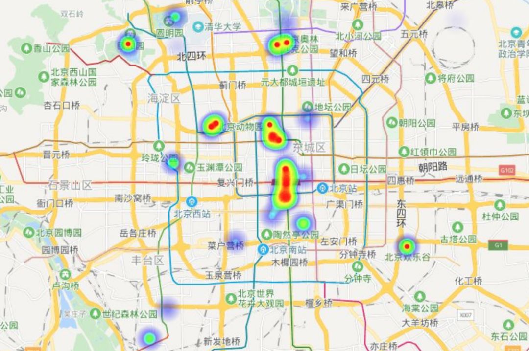 从该热力图中可以看出,今年「五一」期间,故宫博物馆,恭王府,北京动物园等景点最受欢迎