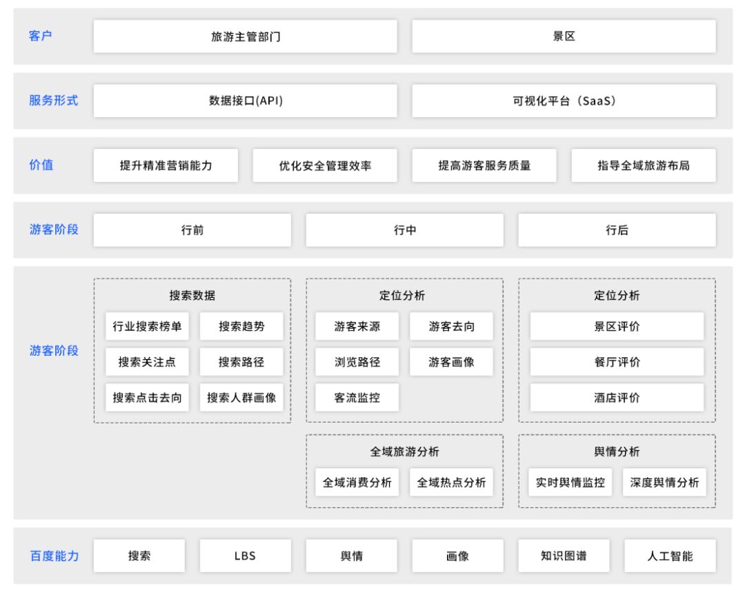 百度:面向旅游主管部门和景区,百度也积极发挥其搜索、画像、舆情、知识图谱及人工智能等数据及技术优势,对游客的行前、行中及行后全覆盖,全面布局旅游大数据,提供可视化平台(SaaS)及数据接口(API)服务,帮助景区提升精准营销能力,优化安全管理效率,提高游客服务质量,指导全域旅游布局。