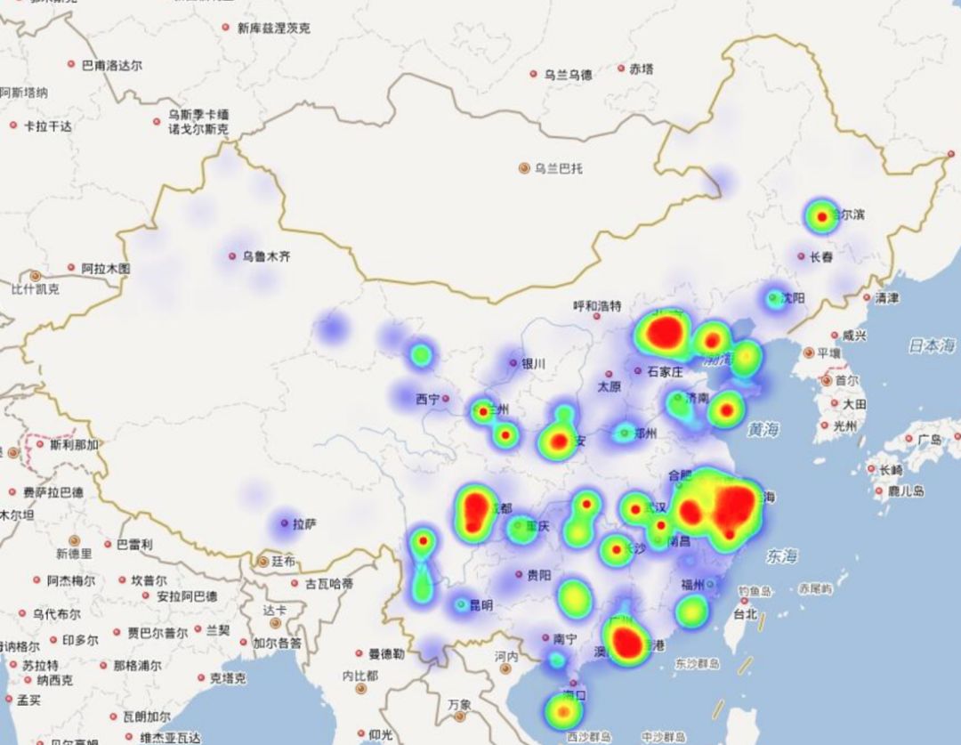 由此图可以很明显地看到,京津冀,长三角,珠三角以及四川地区热力值居前四位