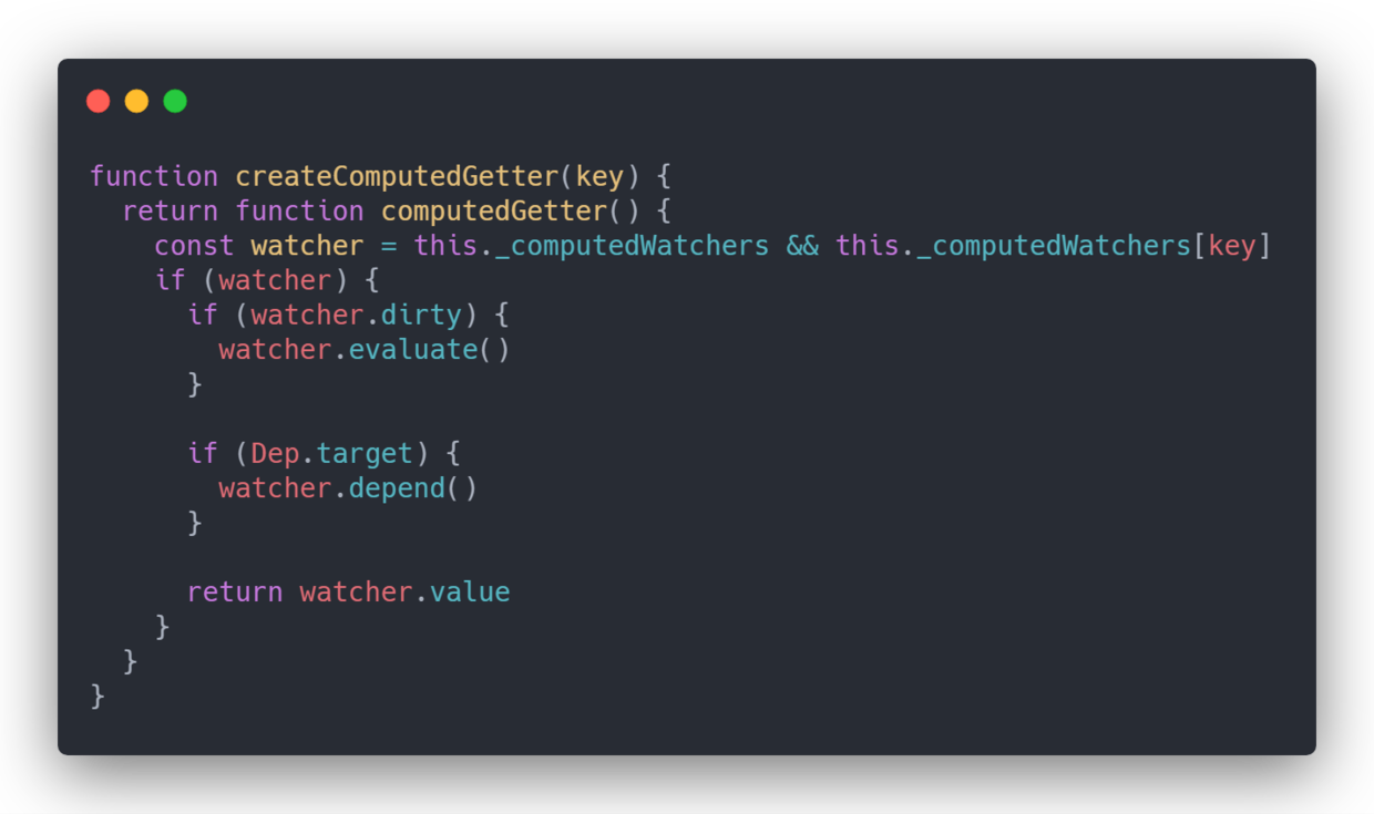 在创建完 computed watcher 后,接着会定义计算属性的 getter 函数,我们在执行计算属性的函数时,实际上执行的是 computedGetter 这个函数
