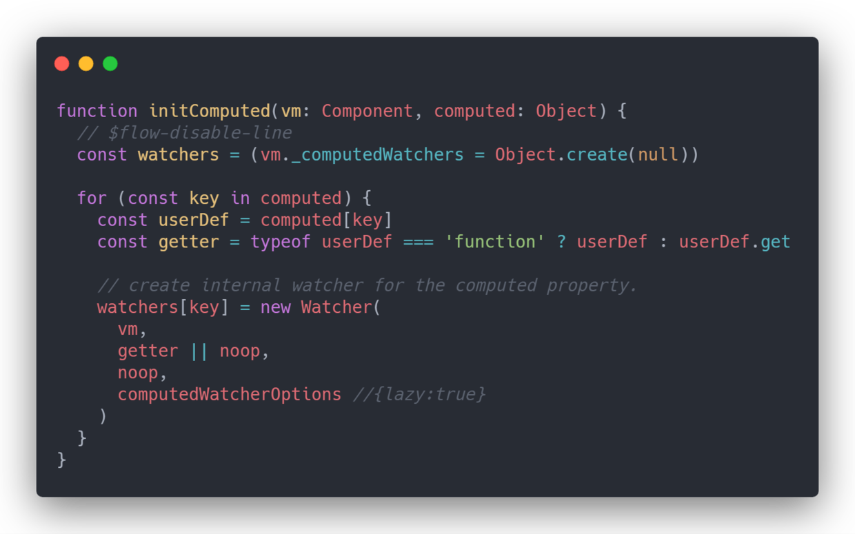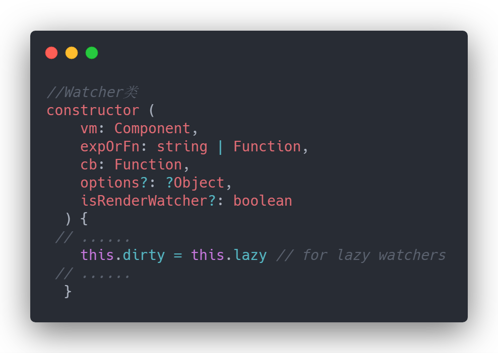 在实例化 watcher 时传入不同的配置项就可以生成不同的 watcher 实例 ,当传入{ lazy: true } 时,实例化的 watcher 即为 computed watcher