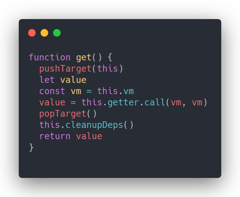 第一行执行了 get 方法, get 方法是所有 watcher 用来求值的通用方法