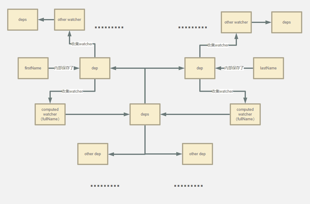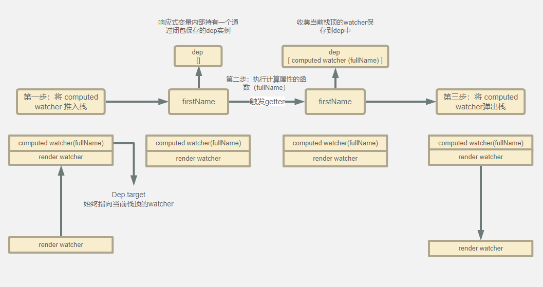 可以看到计算属性 fullName 的函数依赖了 firstName 和 lastName 这2个响应式变量,Vue在内部通过闭包的形式各自保存了一个 dep 对象,这个 dep 对象会收集当前栈顶的 watcher,即收集 fullName 这个计算属性的 computed watcher,所以当计算属性的函数执行完毕后,firstName 和 lastName 内部的 dep 对象中都会保存一个 computed watcher