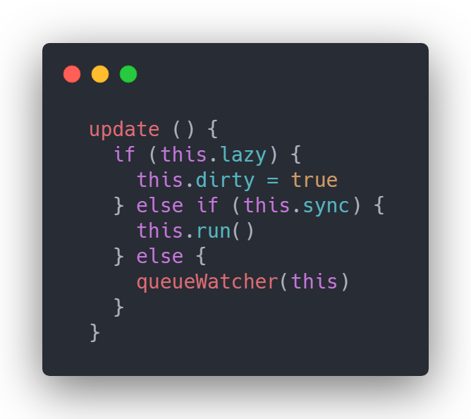 而计算属性依赖的响应式变量内部的 dep 都会保存这个 computed watcher,当它们被修改时,会触发 computed watcher 的 update 方法,将 dirty 标志位置为 true,这样下次有别的 watcher 依赖这个计算属性时就会触发重新计算