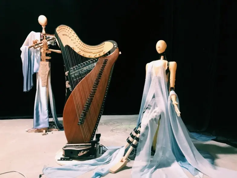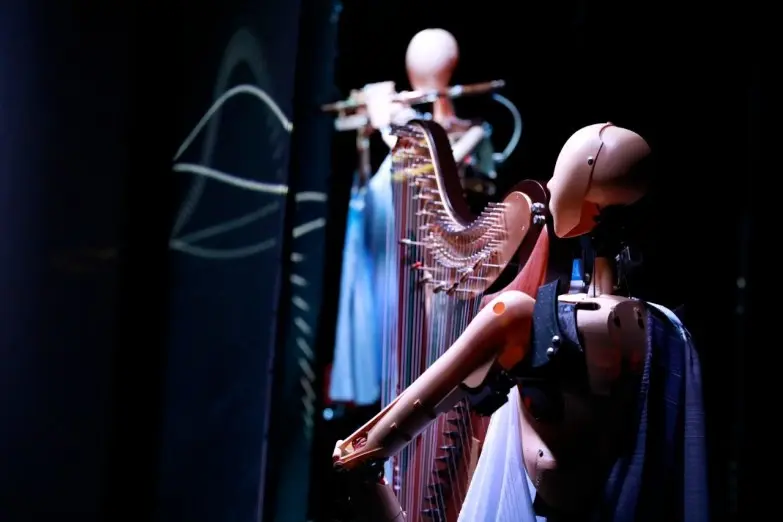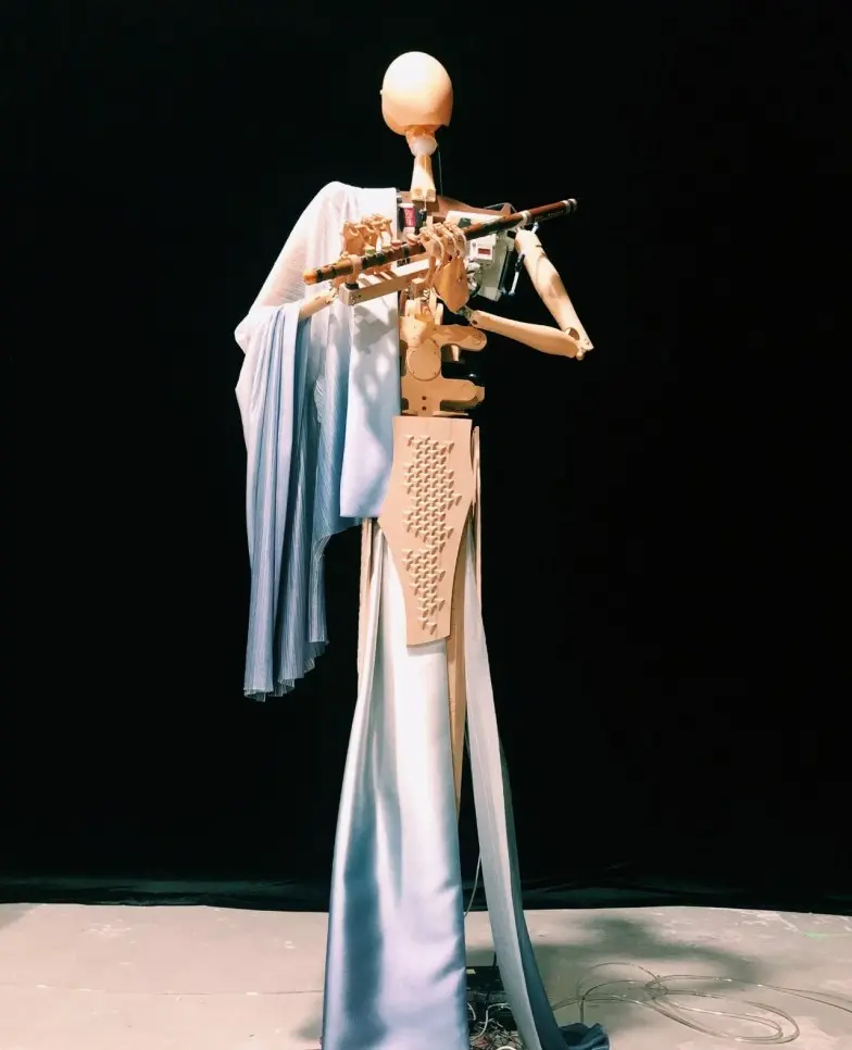 三位机器人乐手演奏的乐器是中国历史悠久的传统乐器——竹笛,箜篌和排鼓。机器人分别采用了吹奏、拨弦、打击三种截然不同的演奏技法。机器人演奏的乐曲全部是原创音乐,也都是由作曲家根据机器人演奏的特点为乐队量身打造的。