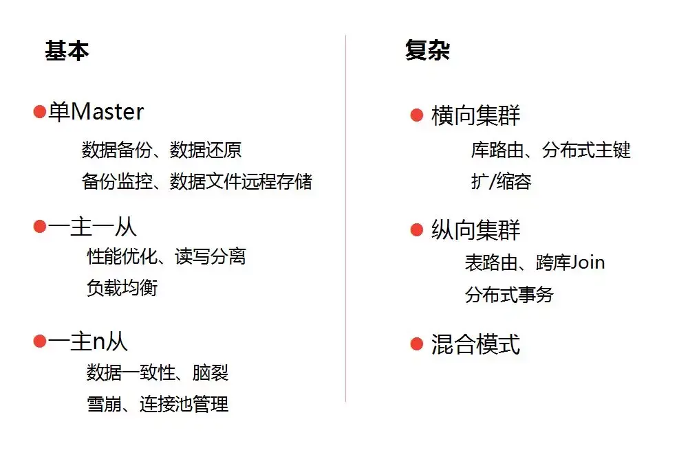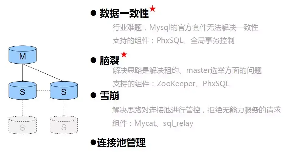 单Master的情况是普遍存在的,对于很多个人站点、初创公司、小型内部系统,考虑到成本、更新频率、系统重要性等问题,系统只依赖一个单例数据库提供服务,基本上已经满足需求。这种场景下我觉得重点应该关注的话题有上图所示的四点。