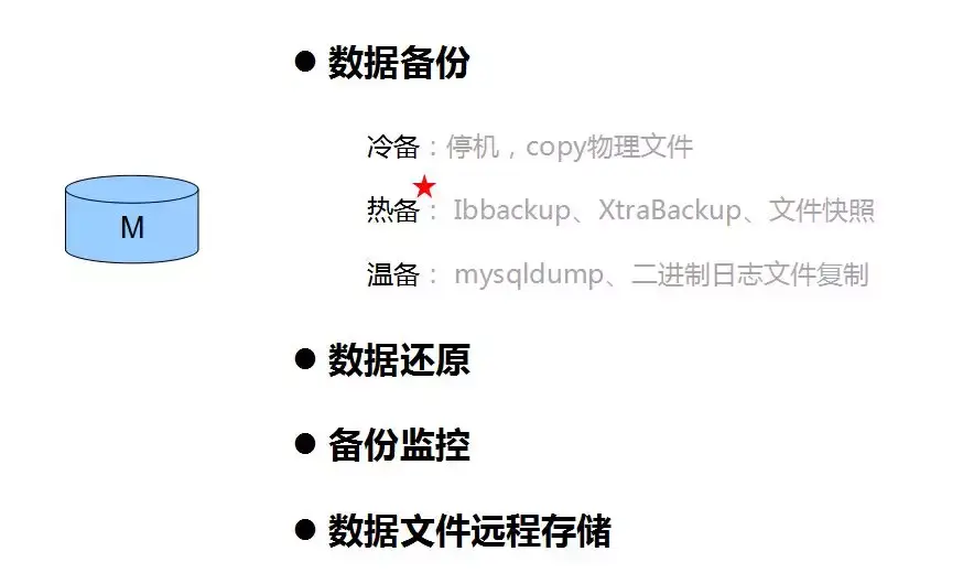 1)冷备:停机,直接copy物理文件,InnoDB引擎(frm文件、共享表空间文件、独立表空间文件、重做日志文件、my.cnf)。