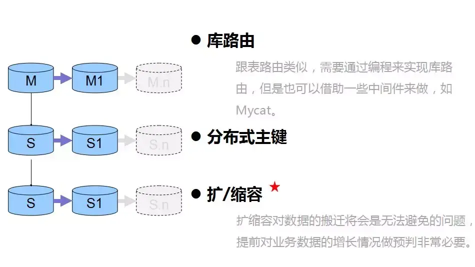 横向集群的切分思路最终是切分子系统,而纵向集群最后遇到的最棘手的问题是扩缩容,我运维的一个系统是提前对数据做了256个切片,256切片中0~127切片和128~255切片分别存在两个一主两从的数据库集群中,系统运维了3年多,目前还没有扩容需求。设计初衷应该是考虑得到,假设有一天数据量非常大,可以把256个切片分4大片,分别存储到4个一主两从的集群中,从而实现扩容。