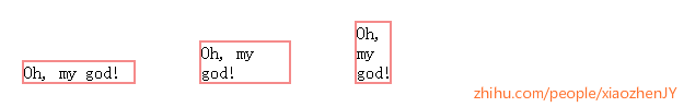 这个box比较特殊,它是以单个文字的形式参与到inline formatting context中的。什么是单个文字,"Oh, my god"不是单个文字,"Oh"是单个文字。这种特殊的参与形式决定了inline box可以跟随containing block(看第11条)的宽度变形,以"<span>Oh, my god</span>"为例,变化如下: