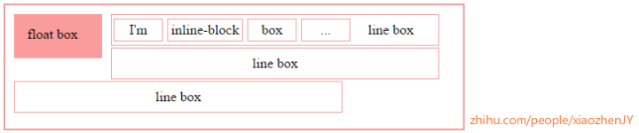 因为float box在inline box的前面,所以它会先占据一块空间。在左边有float box占据的情况下,line box的宽度为 containing block的宽度 — float box的宽度;一旦float box没有占据横向空间了,line box的宽度即为containing block的宽度。而inline box中的文字会依次排在这些line box中,一个line box排不满,换行到下一个line box中。
