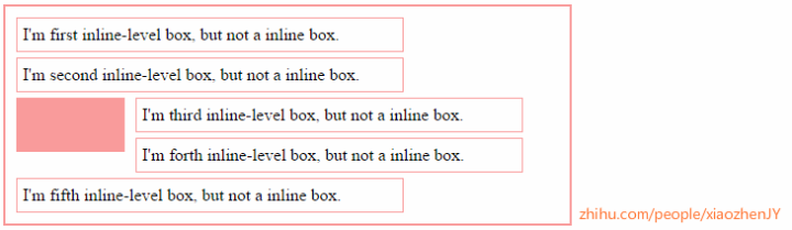 该box的行为与inline box类似,只不过它是以一个整体的形式参与到inline formatting context中。这就意味着,它能否围绕float box取决于containing block的宽度是否足够放置float box和它本身。