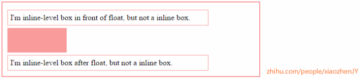 在containing block宽度不足的情况下,float box与非inline box的inline-level box是不能并行排列的,它们只存在上下的关系。