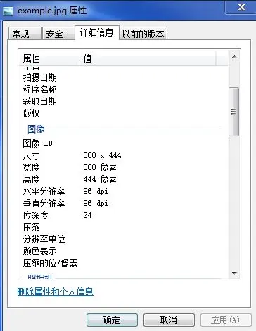 水平/竖直分辨率均为96dpi(1dpx=96dpi)的情况下,尺寸为500*444,说明该图片的位图宽度为500,位图高度为444,即在设备分辨率为1的设备上,图片尺寸为500*444。