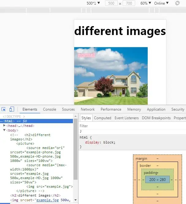 图片的宽度为100%的视图窗口,应该为500px,又设备像素密度为2,那么图片所需像素宽度为500*2=1000w,chrome浏览器选择了example-HD-phone.jpg。