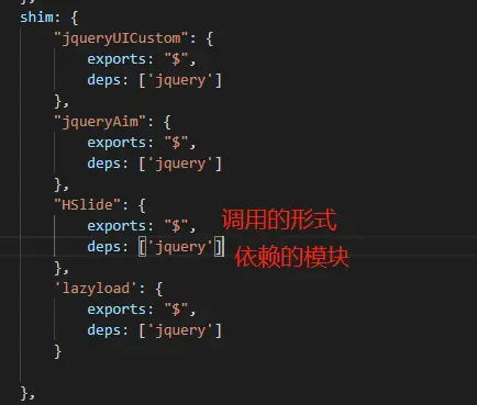 require.config()接受一个配置对象,这个对象除了有前面说过的paths属性之外,还有一个shim属性,专门用来配置不兼容的模块。具体来说,每个模块要定义(1)exports值(输出的变量名),表明这个模块外部调用时的名称;(2)deps数组,表明该模块的依赖性。