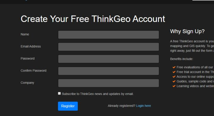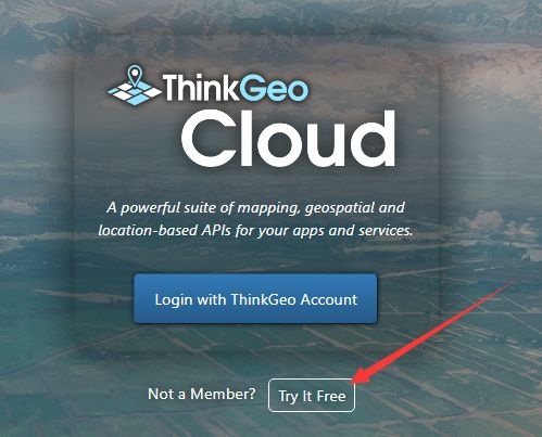 言归正传,首先访问 cloud.thinkgeo.com , 如果没有注册用户,请点击“Try It Free”,进行注册,如果已有账号请自行直接登录。 流程如下。