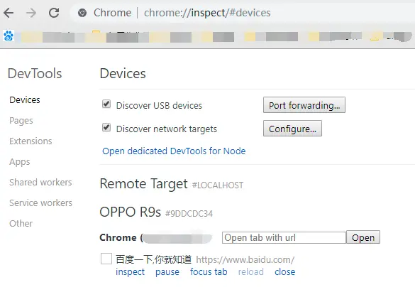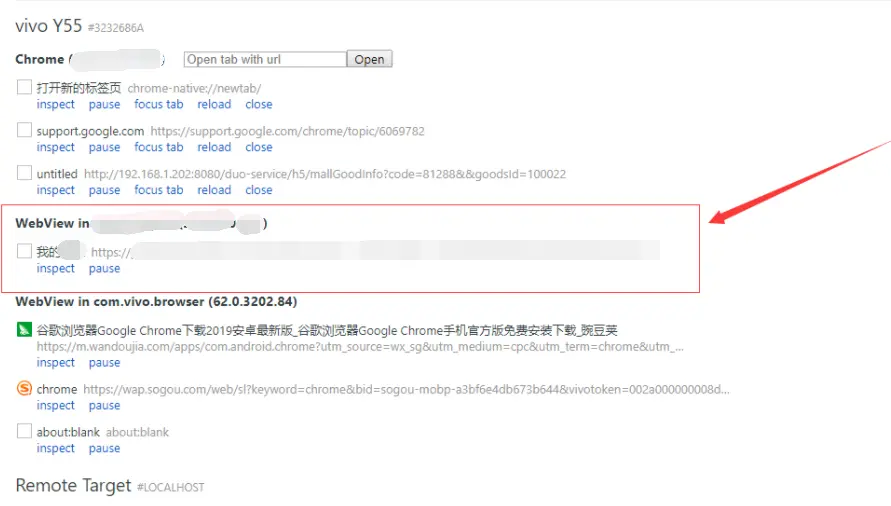 6.加好后,打开手机APP的webview页面,同时打开PC端的chrome://inspect/#devices页面,可以看到出现了webview页面的信息。