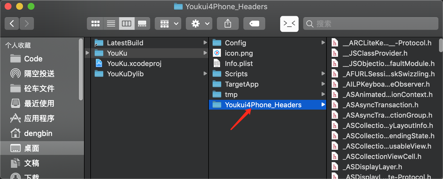 Run!成功之后可以发现在工程目录下多了一个文件夹Youkui4Phone_Headers,其中就是优酷的所有的头文件了。