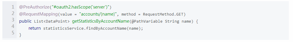 PiggyMetrics(帐户服务,统计服务,通知服务和浏览器)中的每个客户端都有一个范围:server用于后端服务,以及ui- 用于浏览器。因此,我们还可以保护控制器免受外部访问,例如: