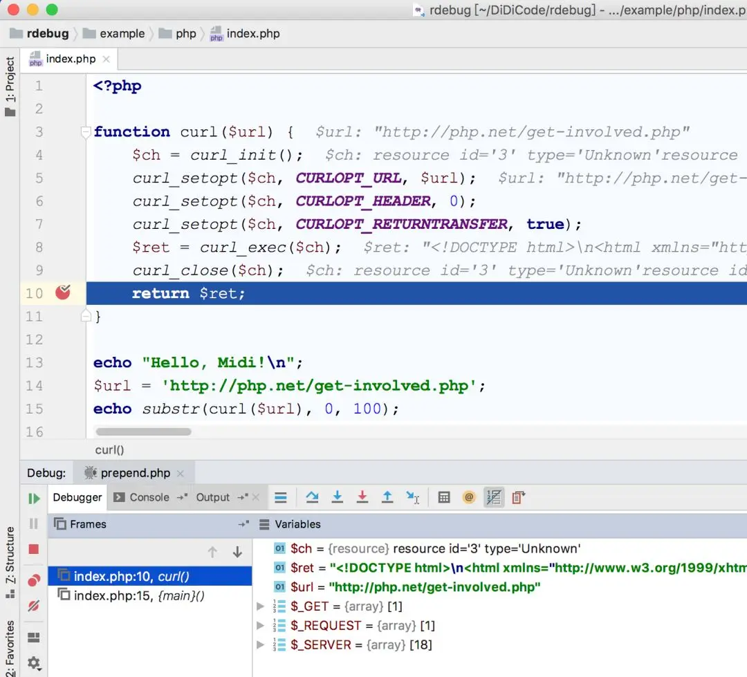最高效的功能是 Xdebug 联动调试,通过对代码设置断点即可使用线上流量进行调试。通过这种方式,可以用来研究代码、排查问题、查看下游接口响应格式及数据等,是一个开发调试利器。