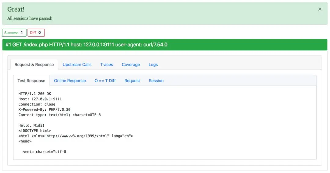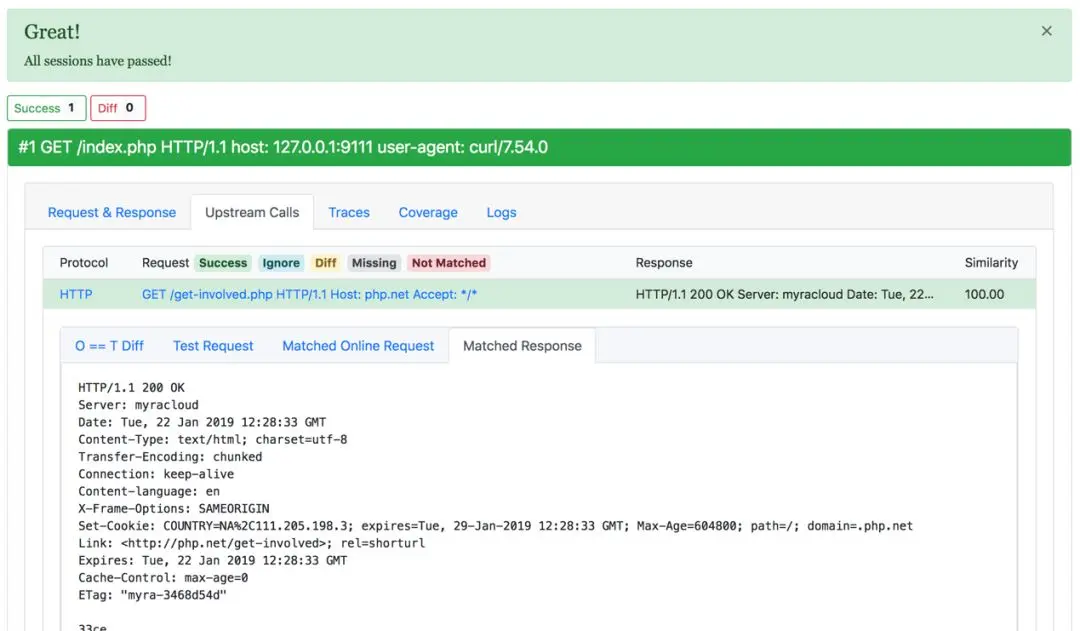下游调用报告,会列举出所有的下游调用,包括协议、请求内容、匹配上的响应以及相识度。通过不同的背景颜色,标记出完全匹配的流量、存在噪点的调用、缺失的调用、新增的调用等。