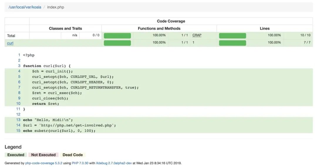 结合 Xdebug 生成覆盖率报告,能够清楚的看到哪些代码被执行、哪些代码未被执行以及接口的覆盖率情况。