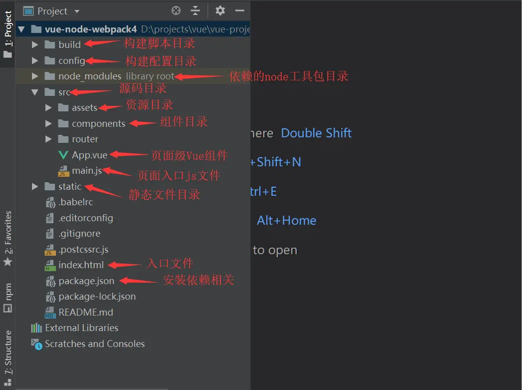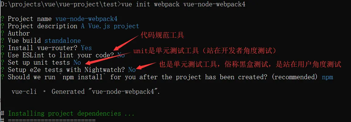 ② 配置完成后,可以看到目录下多出了一个项目文件夹vue-node-webpack4,然后cd进入这个文件夹,安装依赖:
