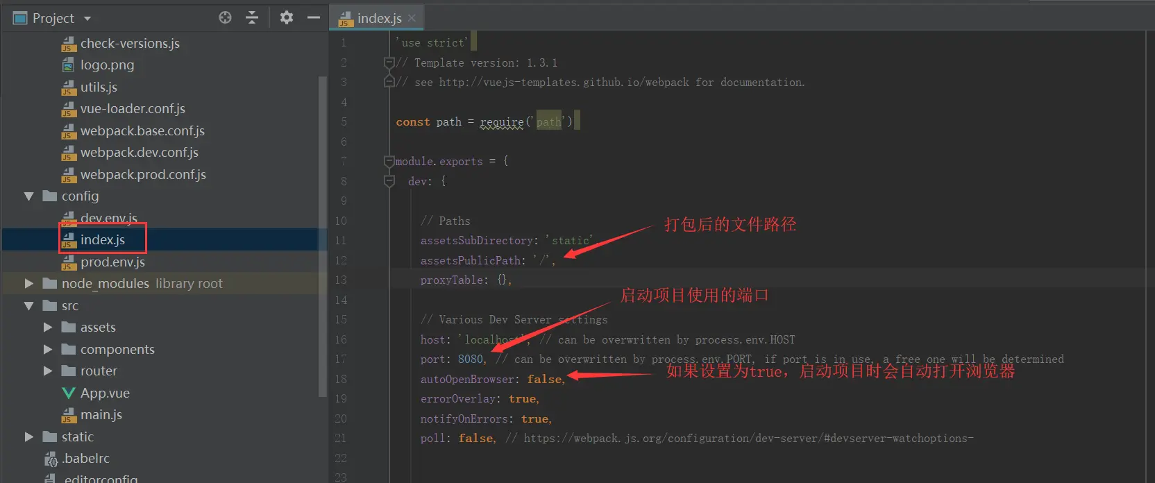 npm run dev如果浏览器打开之后,没有加载出页面,有可能是本地的 8080 端口被占用,需要修改一下配置文件 config里的index.js