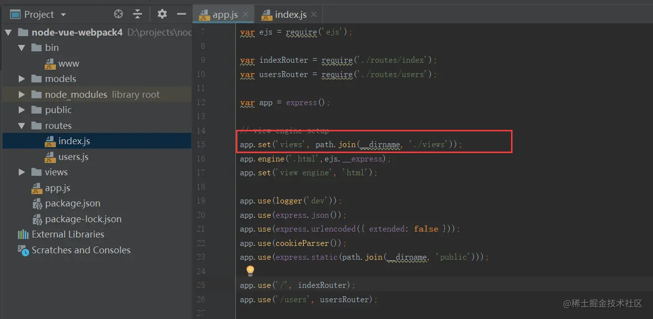 安装完成后再入口文佳app.js更改相关配置,首先引入ejs插件