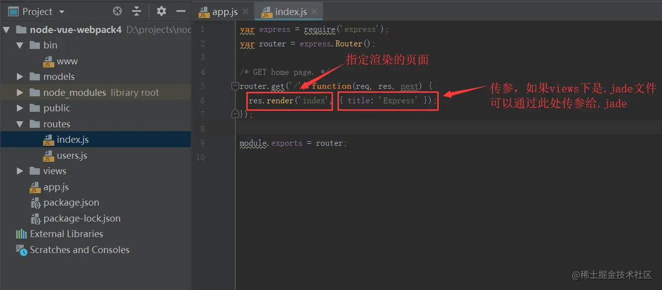 就会运行routes下面对应的index.js文件,然后会render里面的index,render会自动加载views下面的文件